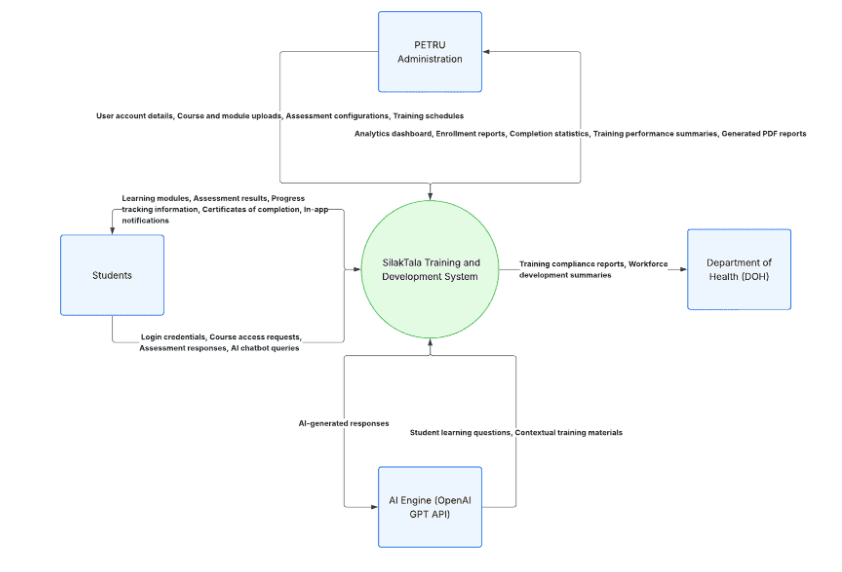 The implementation process focused on translating business requirements into a structured application architecture, data flow, and AI-assisted learning workflow. At the system level, SilakTala was designed around three core concerns: user interaction through web and mobile clients, application processing through a backend service layer, and persistent data management through a relational database, with each layer handling a clearly defined responsibility. From a process standpoint, the platform supports end-to-end learning operations, beginning with user actions such as login, course access, assessments, and training interactions, and extending through administrative functions like module uploads, scheduling, analytics, reporting, and completion tracking. The data flow diagram also shows how the system exchanges information with an AI engine for contextual responses and produces training compliance and workforce development outputs for institutional stakeholders, which reinforces that the platform was designed as an operational system, not just a content portal. The AI-assisted component follows a Retrieval-Augmented Generation pattern. When a user submits a query, the system generates an embedding, searches a vector store for relevant content, retrieves supporting text chunks when a match is found, augments the prompt with that context, and only then sends the request to the language model; if no relevant context exists, the response is constrained accordingly rather than inventing unsupported answers.